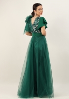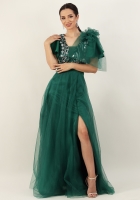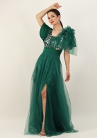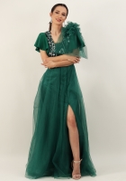 - Bustul cambrat accesorizat cu funda maxi la umar pe o parte;