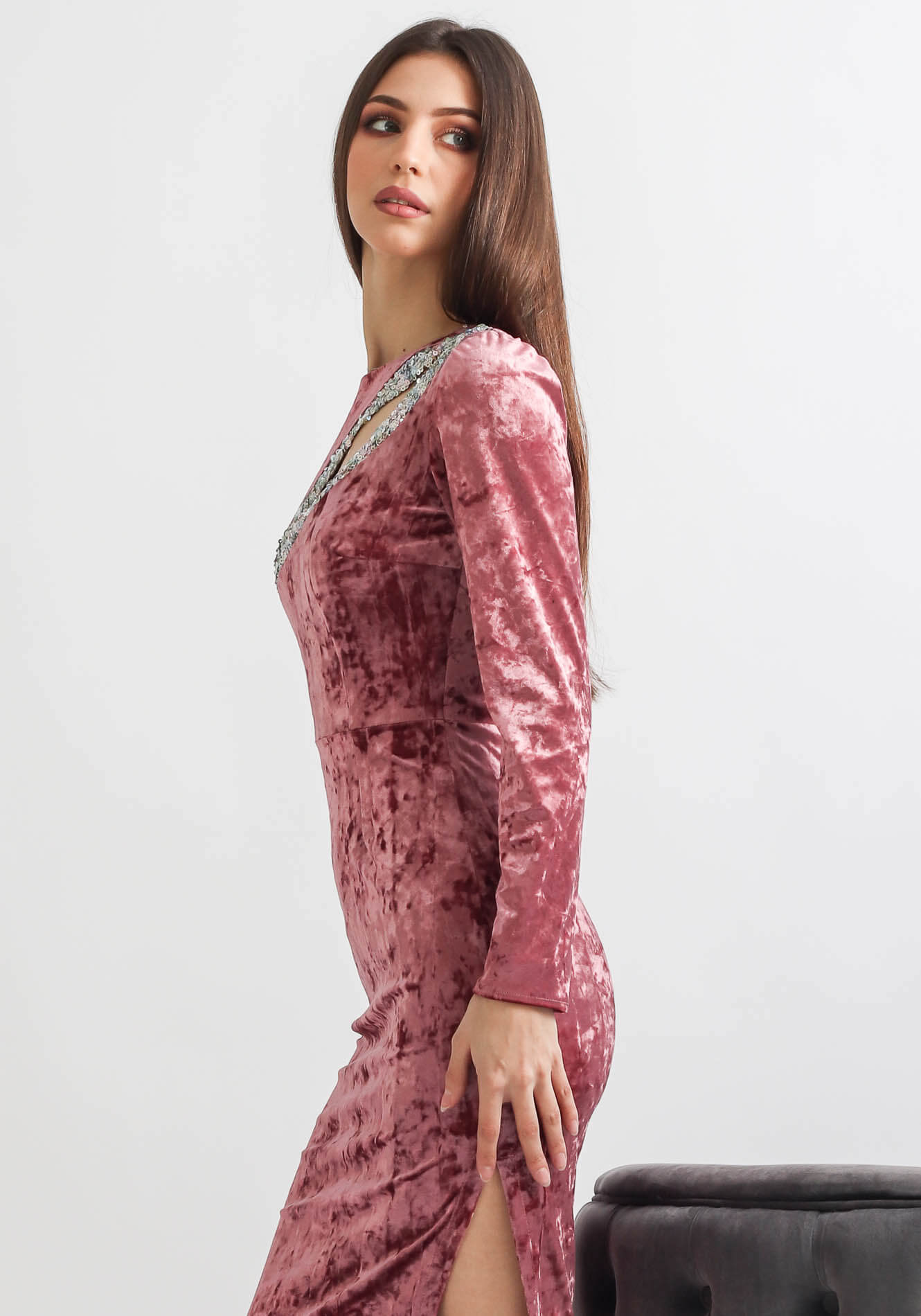 - Rochie conica din catifea, cu reflexii si paiete roz;