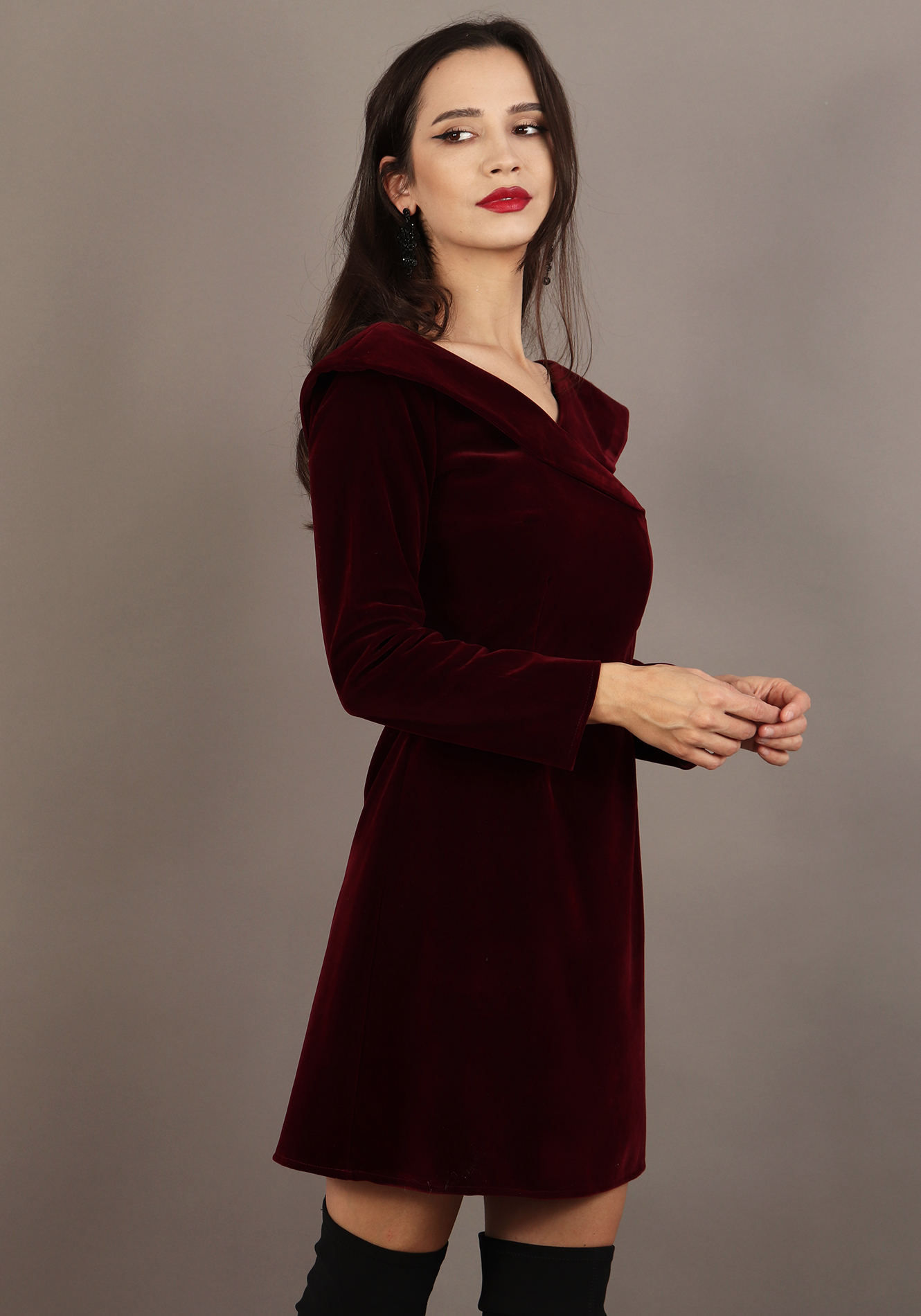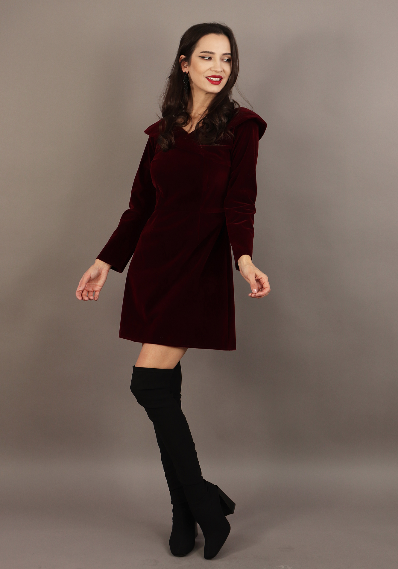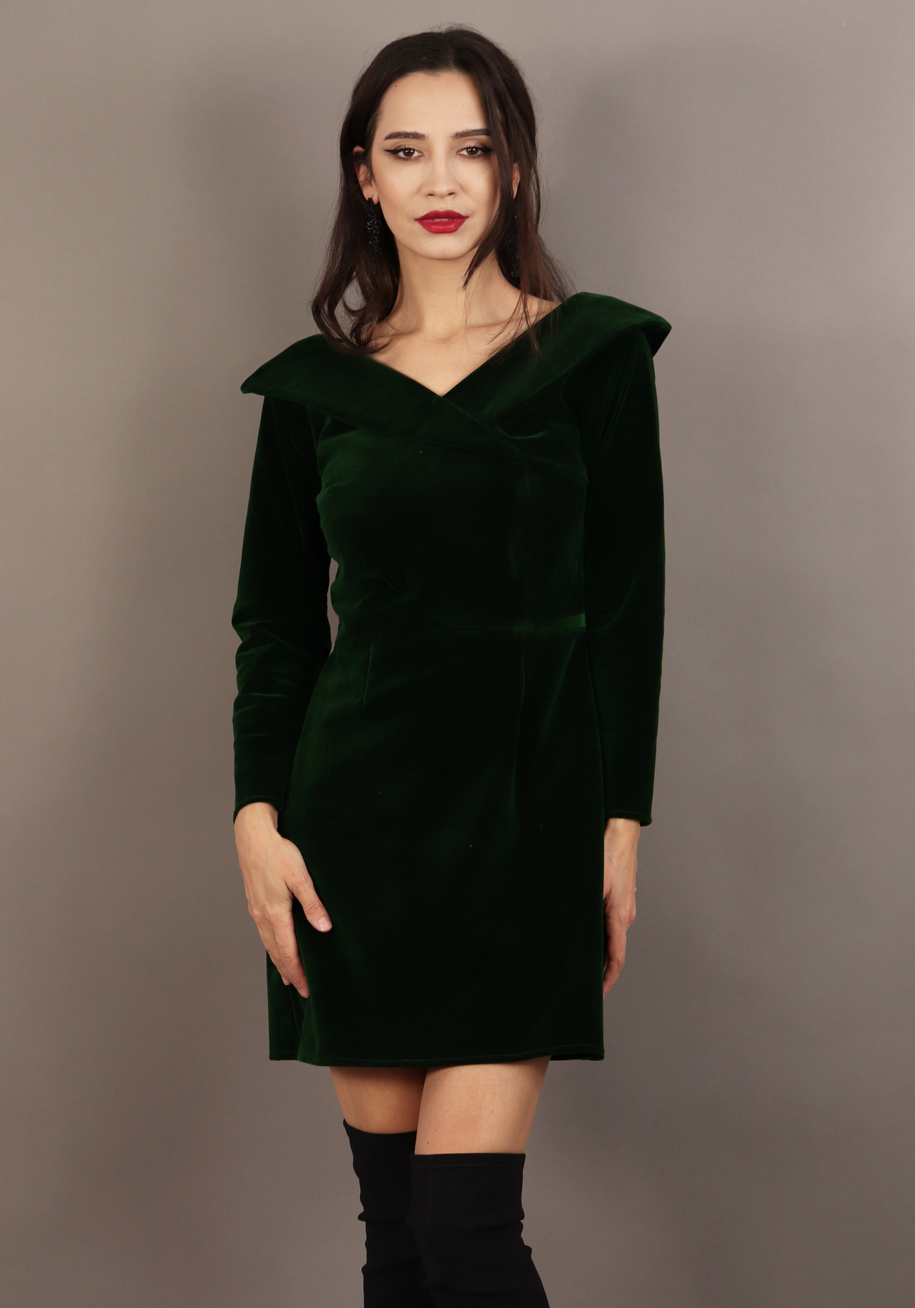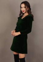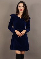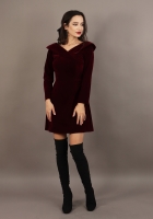 - Rochie evazata cu decolteu V in fata si in spate si gulere integrate in cusatura;